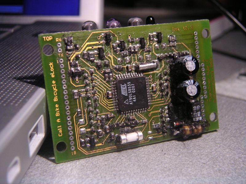 Die gesamte Platine ist mit schwarzem Silikon übergossen, das man erstmal runterkratzen muss. Das geht prima mit einer Mess-Spitze. Außer einer streichholzschachtelgroßen Platine (Rückseite Datenschleuder 82), auf der ein Atmel AT90S8535 (8-Bit-Risc-Prozessor, 4x8-IO-Pins, 8KB Flash, 512-Bytes-EEProm und 512-Bytes-RAM) [1], ein paar LEDs (rot, grün und IR) und IR-Receiver aufgebracht sind, enthält der Kasten noch ein paar andere elektrische Bauteile (Motor, Schalter und ein Beeper). Es ist auch ein Neigungssensor vorhanden, aber im Code wird er nicht benutzt. Daher bestand keine Gefahr, uns zu orten. Es wurden ein paar Bilder von der Aktion gemacht, aber dann lag die Technik erstmal zwei Monate einsam in einer Kiste, weil wir es nicht geschafft haben, das CallABike zu booten. Es dauerte eine Weile, bis wir merkten, dass das System nach dem Booten durch ein Infrarot-Signal aktiviert werden muss. Das war mehr oder weniger Zufall.