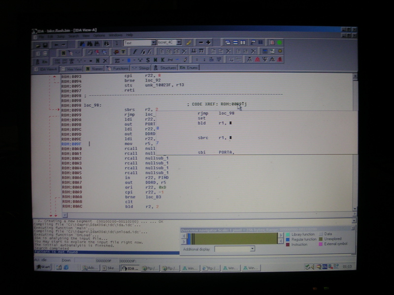 In den nächsten Wochen waren mehrere Hacker damit beschäftigt, den ausgelesenen Assemblercode zu verstehen und zu dokumentieren. Dazu verwendeten wir AVR-Studio und Ida Pro. Den Scramble Code (zum Berechnen der Ausleih- und Abgabecodes) fanden wir relativ schnell, da sich dort eine Menge rotate-und-shift-Befehle befanden. Den Initialisierungscode erkannten wir wieder, da wir wußten, daß sich der Motor beim Einschalten zweimal herumdreht. So konnten wir das Gelernte immer wieder an unserem Prototyp auf Richtigkeit überprüfen.